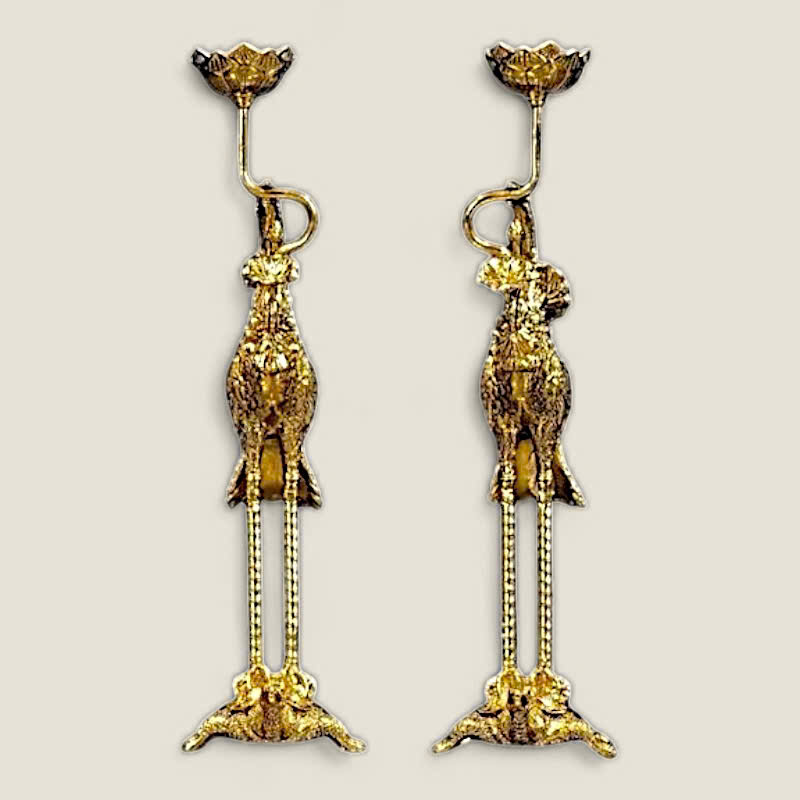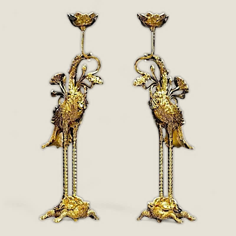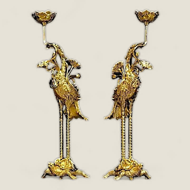 Thiết kế: Bộ sản phẩm gồm một cặp hạc được tạo tác với tư thế đứng trên lưng một con rùa. Hạc có dáng vẻ thanh thoát, đang ngẩng cao đầu, sải cánh. Các chi tiết trên thân hạc như lông vũ, mỏ và mào được chạm khắc tỉ mỉ. Tượng rùa có vẻ ngoài vững chãi, hiền lành, tạo nên một tổng thể hài hòa và mang ý nghĩa phong thủy sâu sắc.