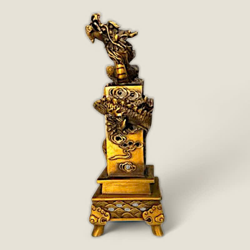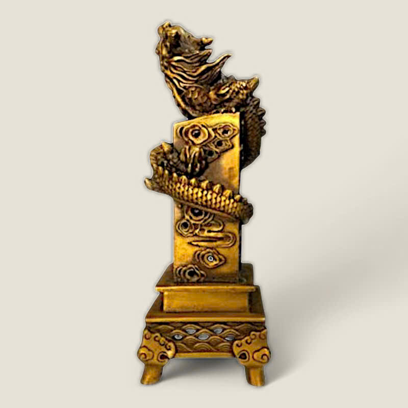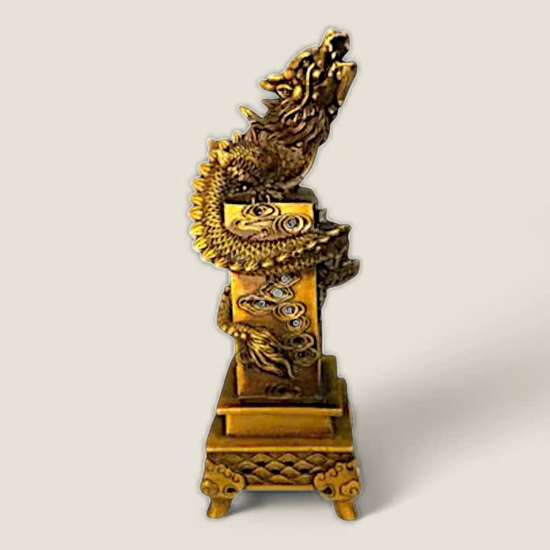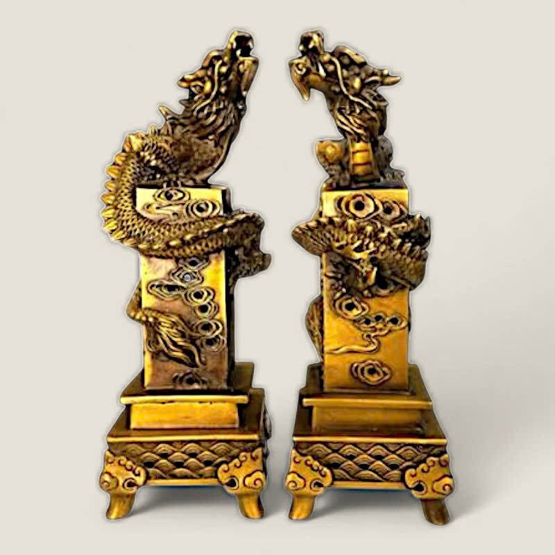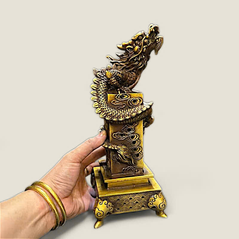 Thiết kế: Bộ lư xông trầm gồm hai phần: một trụ rồng cao và một lư nhỏ. Trụ được chế tác với hình ảnh rồng quấn quanh thân, đầu rồng ngẩng cao dũng mãnh, kết hợp cùng các họa tiết đám mây (Long Vân), thể hiện sự uy quyền. Lư nhỏ có hình dáng vuông vức, với các họa tiết sóng nước tinh tế, tạo nên một tổng thể hài hòa và độc đáo.