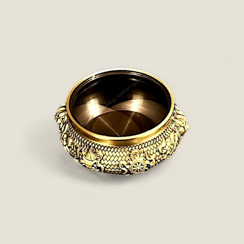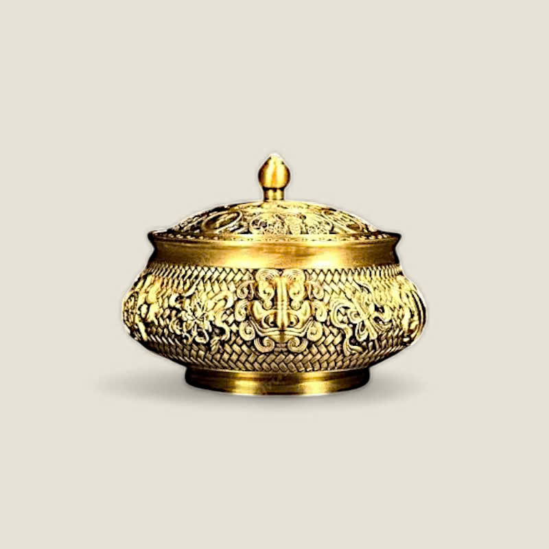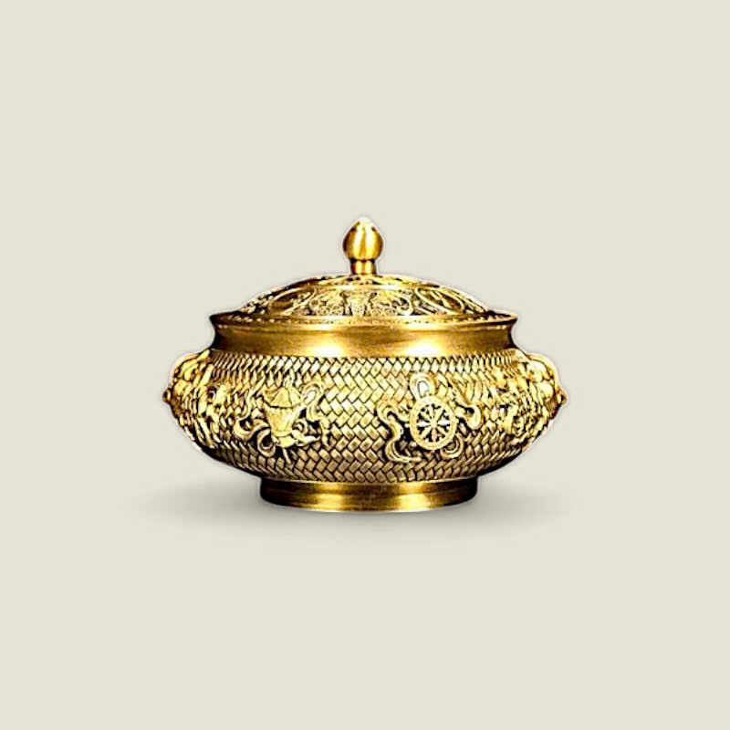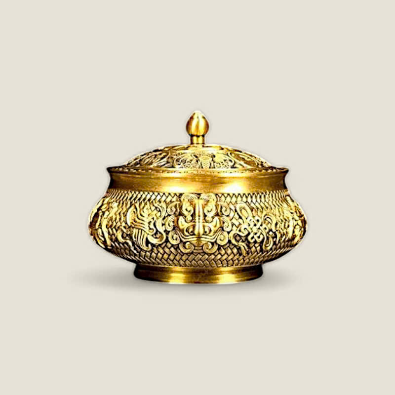 Thiết Kế: Lư xông trầm được chế tác theo hình dáng tròn, bầu (dạng Tụ Bảo Bồn), có nắp đậy tinh xảo, thích hợp để đốt trầm nụ hoặc trầm bột. Toàn bộ thân và nắp lư được chạm khắc nổi dày đặc Bát Bảo Cát Tường (Ashtamangala – Tám Pháp Khí Cát Tường), là các biểu tượng thiêng liêng của Phật giáo Mật Tông/Kim Cương Thừa (như Bánh xe Pháp, Hoa Sen, Song Ngư, v.v.). Nắp lư có các lỗ thoát khói được thiết kế khéo léo qua hoa văn, mang ý nghĩa lan tỏa năng lượng phúc lành khắp không gian.