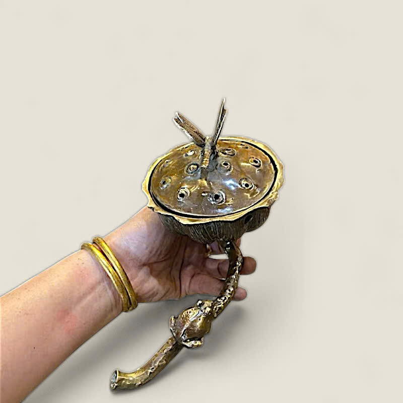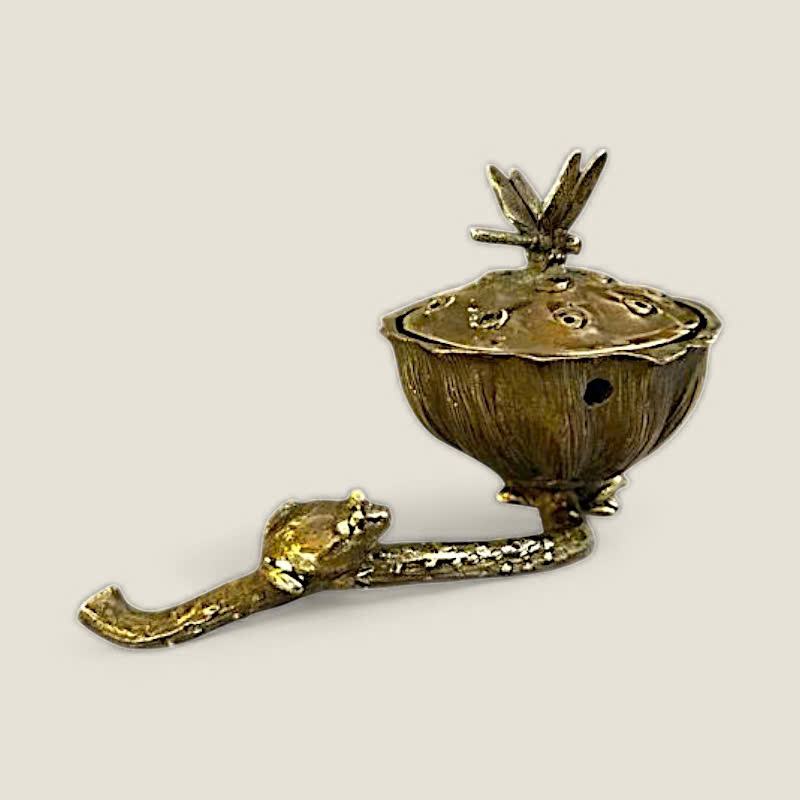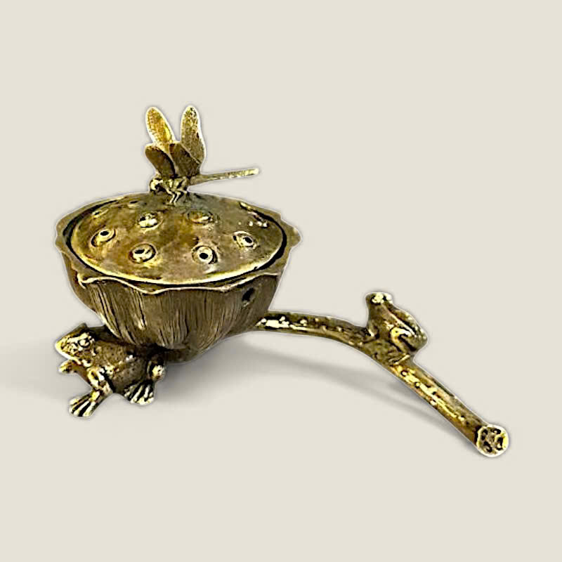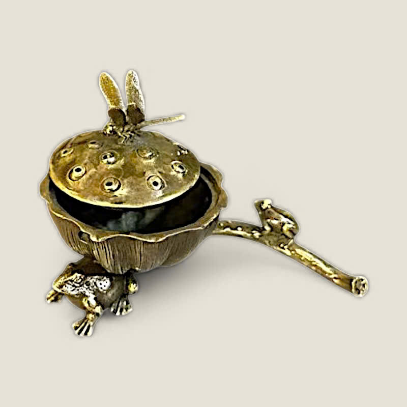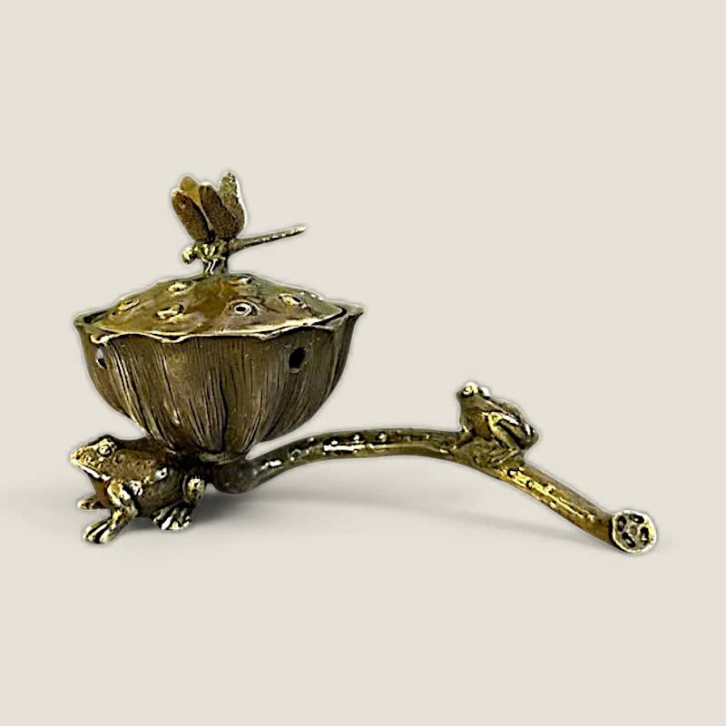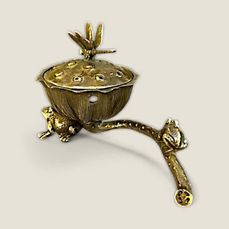 Thiết kế: Lư xông trầm có thiết kế độc đáo, lấy cảm hứng từ hình ảnh búp sen đang nở, với nắp lư là một chú chuồn chuồn tinh xảo đậu trên. Bên cạnh thân lư là một chú ếch nhỏ đang ngồi, tạo nên một khung cảnh hồ sen sống động, gần gũi với thiên nhiên. Các lỗ thoát khói được bố trí tinh tế trên nắp, giúp khói trầm lan tỏa nhẹ nhàng.