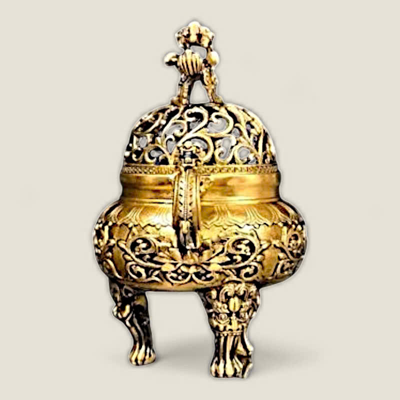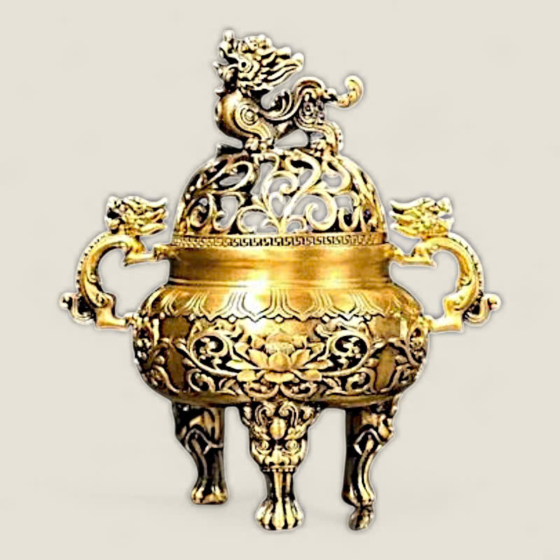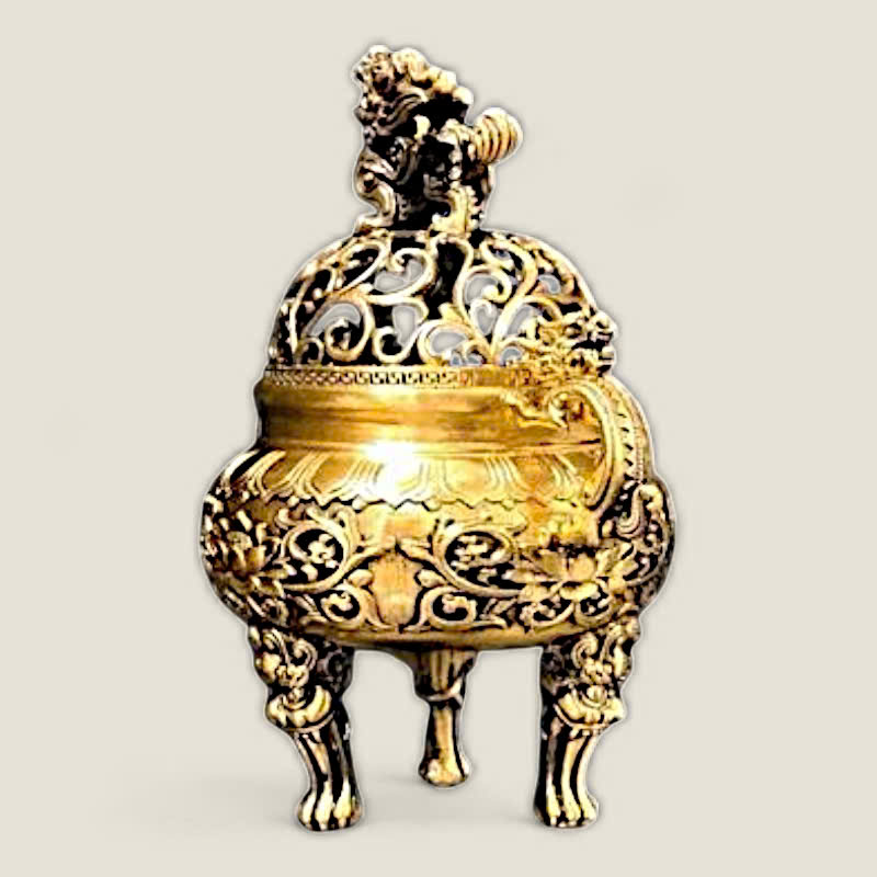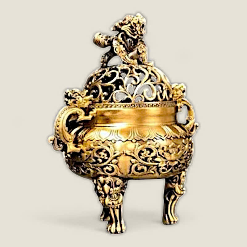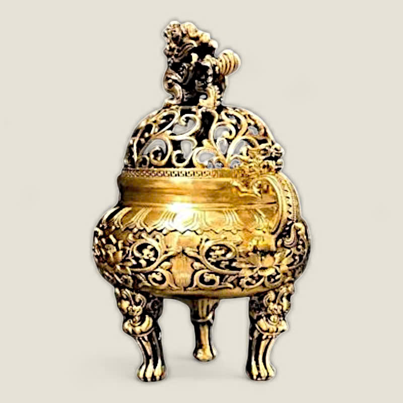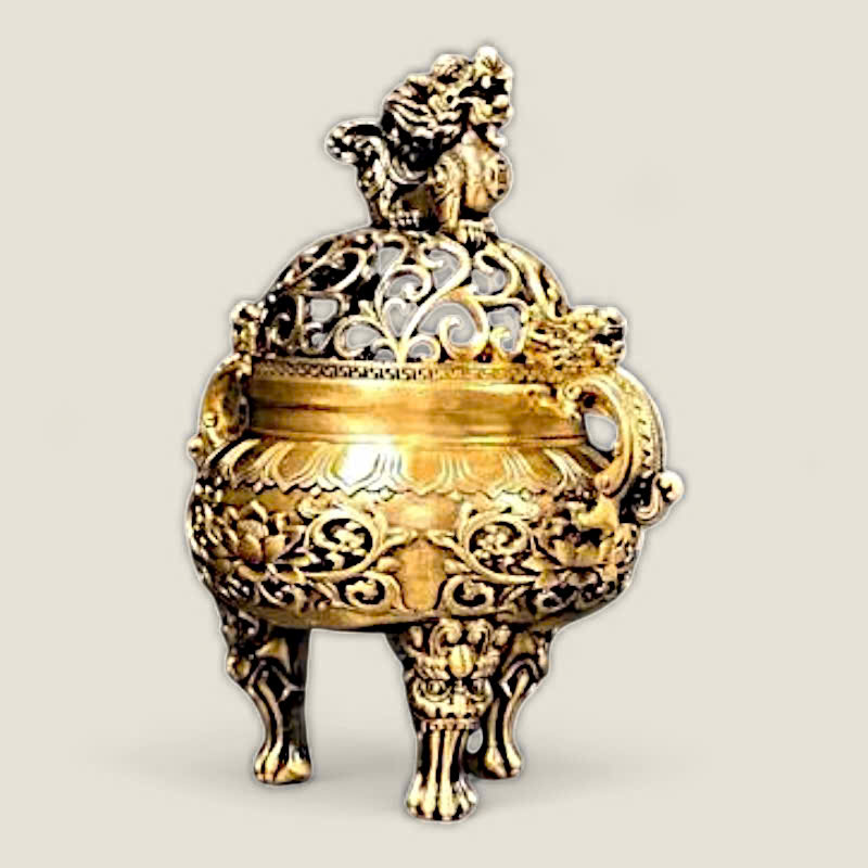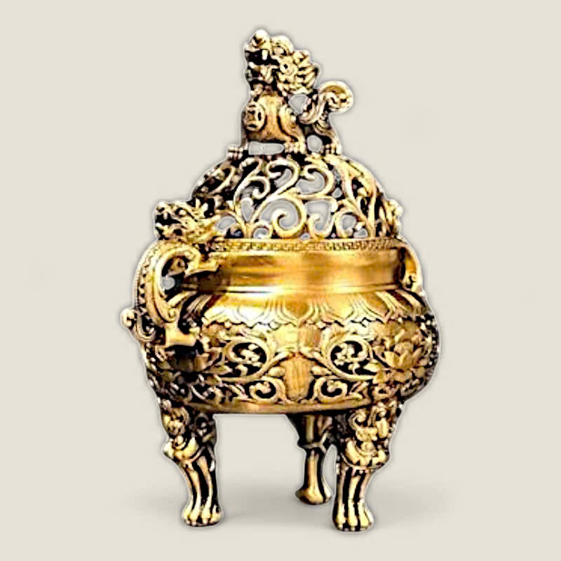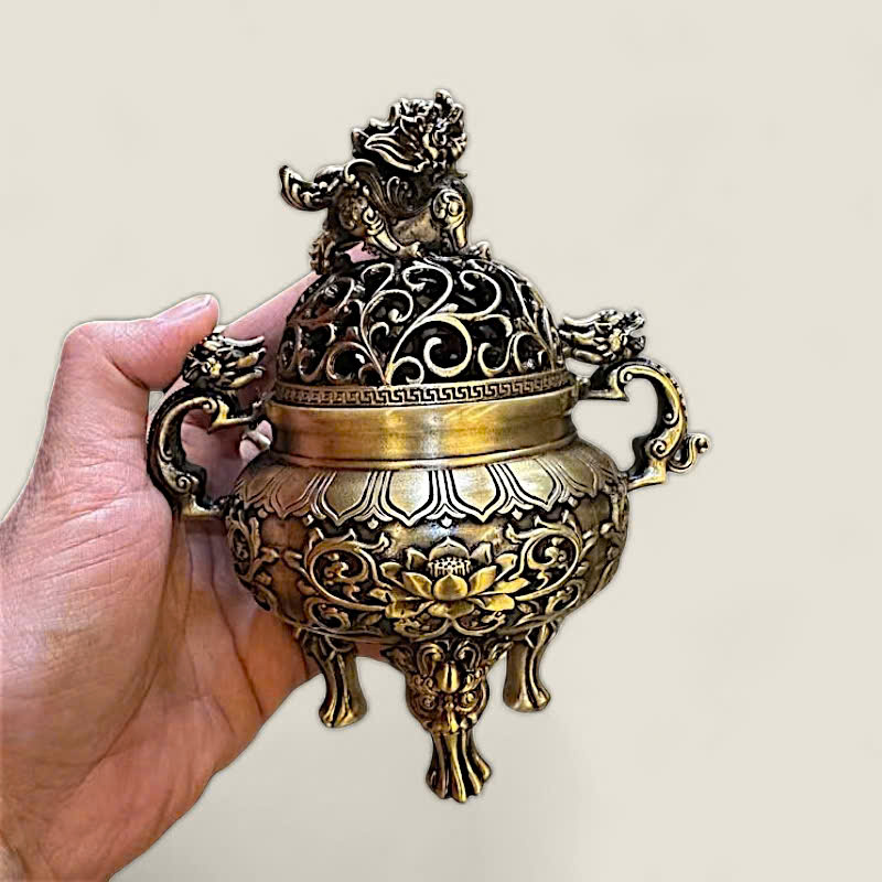 Thiết kế: Lư xông trầm được chế tác theo kiểu dáng lư hương cổ điển, đứng trên ba chân vững chãi. Thân lư được chạm khắc tinh xảo với các họa tiết hoa sen và mây. Phần nắp có hoa văn lưới cầu kỳ, với tượng Tỳ Hưu dũng mãnh ngự trị bên trên, vừa là điểm nhấn nghệ thuật vừa giúp khói trầm lan tỏa.