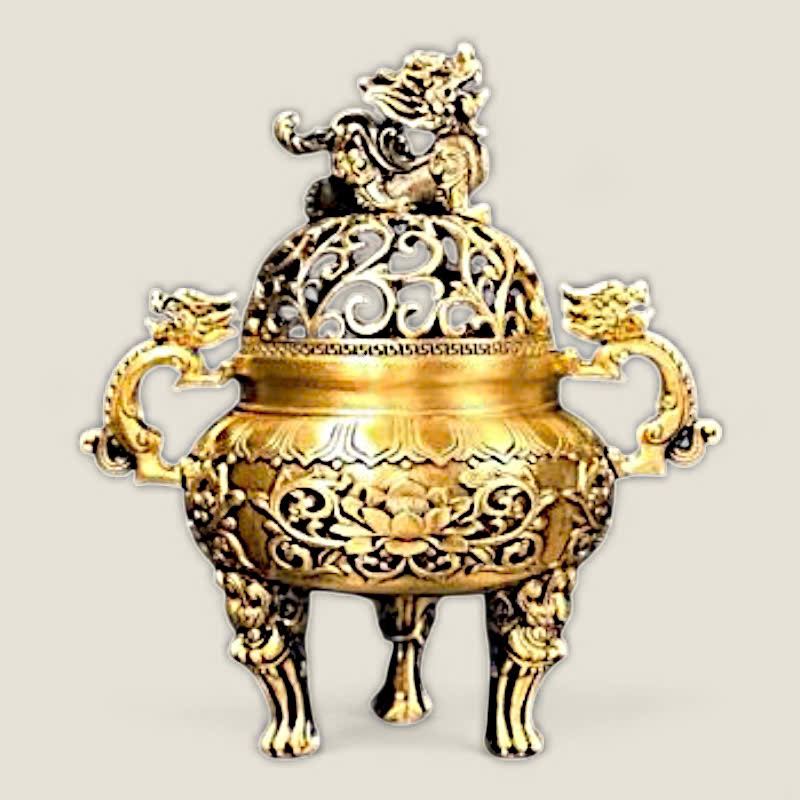 Chất liệu: Sản phẩm được làm từ đồng, đúc nguyên khối, đảm bảo độ bền và tính nghệ thuật cao. Bề mặt lư hương có màu vàng đồng sáng, làm nổi bật đường nét tinh xảo và vẻ ngoài trang trọng.