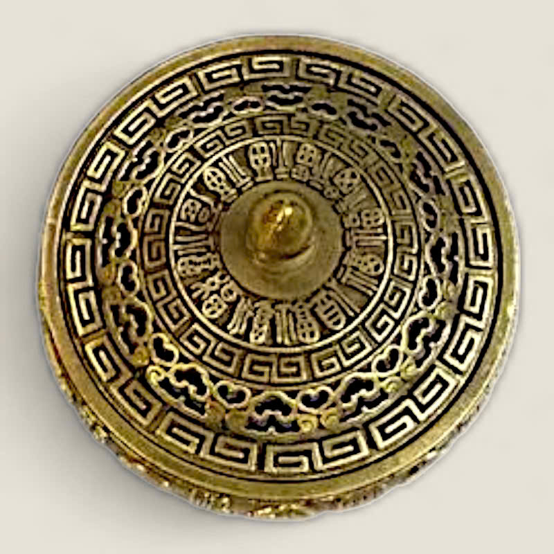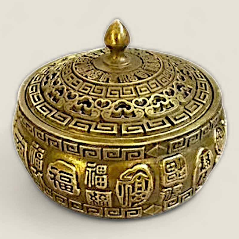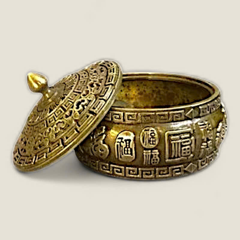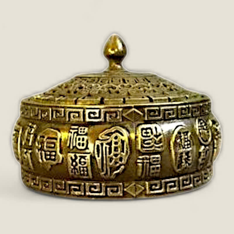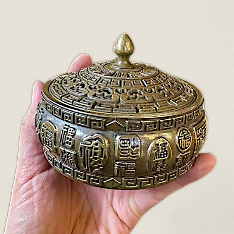 Thiết kế: Lư xông trầm có hình dáng tròn, với miệng rộng và lòng sâu. Điểm nhấn là các hoa văn được chạm khắc nổi bật ở phần thân, với các chữ Hán và các hoa văn truyền thống, mang ý nghĩa may mắn và tài lộc.