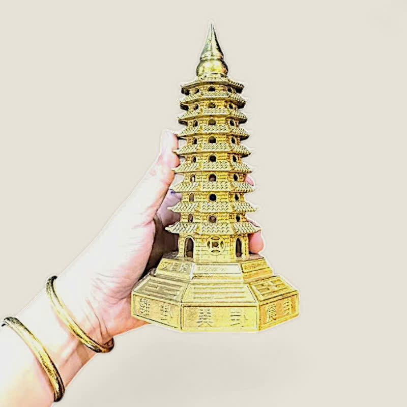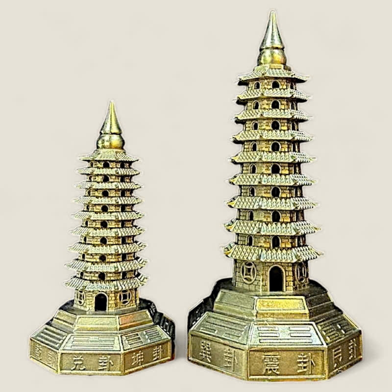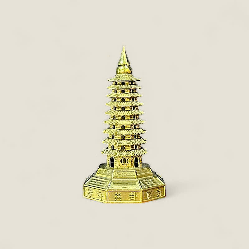 Thiết Kế: Tượng mô hình tháp được chế tác theo hình dáng Bảo Tháp nhiều tầng (thường là 7, 9, hoặc 13 tầng), là biểu tượng của Phật Giáo và Trí Tuệ. Tháp có chóp nhọn vươn cao, thân tháp có nhiều tầng mái xếp chồng lên nhau. Tháp được đặt trên một đế hình bát giác (Bát Quái), chạm khắc rõ ràng các quẻ dịch (Bát Quái) xung quanh, thể hiện sự chống đỡ và bảo vệ từ đất trời. Tượng có kích thước nhỏ gọn, thích hợp cho việc trưng bày trên bàn hoặc giá sách.