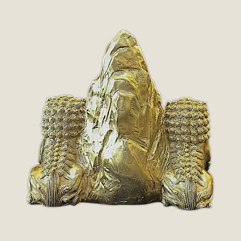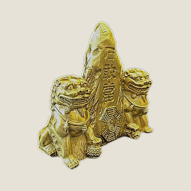Thiết kế: Tượng là một tác phẩm phong thủy độc đáo, kết hợp hình ảnh hai linh vật Lân Sư dũng mãnh đứng canh giữ hai bên một tấm đá (Thái Sơn Thạch). Tấm đá có khắc chữ Hán cổ và biểu tượng Bát Quái, thể hiện quyền năng trấn giữ. Các chi tiết trên đầu Sư Tử và bệ đá được điêu khắc tỉ mỉ, toát lên vẻ uy nghiêm và bảo hộ.