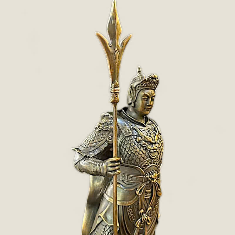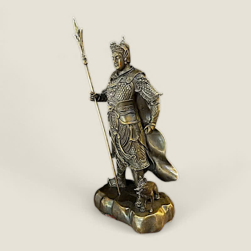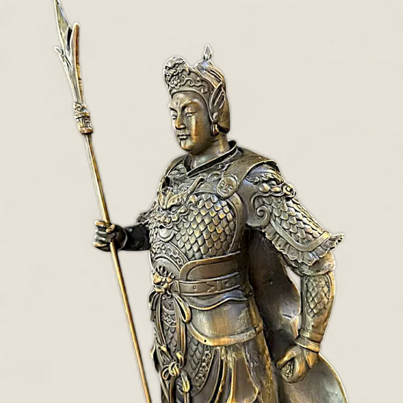 Chất Liệu: Sản phẩm được đúc từ đồng nguyên khối, với kỹ thuật xử lý bề mặt hun màu giả cổ (hoặc đồng mộc), làm nổi bật từng chi tiết giáp trụ và thần thái. Chất liệu đồng có tính Dương mạnh mẽ, là vật khí lý tưởng để trấn sát và tăng cường chính khí.