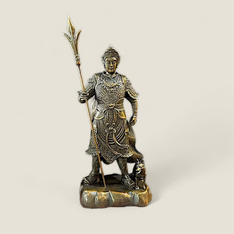 Thiết Kế: Tượng khắc họa Nhị Lang Thần (Dương Tiễn), vị chiến thần vĩ đại của Thiên Đình, trong tư thế đứng uy dũng trên bệ đá (tượng trưng cho sự kiên cường). Ngài mặc giáp trụ, chiến bào chỉnh tề, khuôn mặt khôi ngô, oai phong (thường có con mắt thứ ba đóng kín hoặc mở hé). Tay Ngài cầm chắc Tam Tiêm Lưỡng Nhận Đao (vũ khí nổi tiếng), biểu thị khả năng chinh phạt và dẹp loạn. Bên cạnh chân Ngài là linh thú Hạo Thiên Khuyển (chó trời), người bạn đồng hành trung thành và dũng mãnh. Toàn bộ tác phẩm toát lên khí thế bất phàm, hiên ngang.