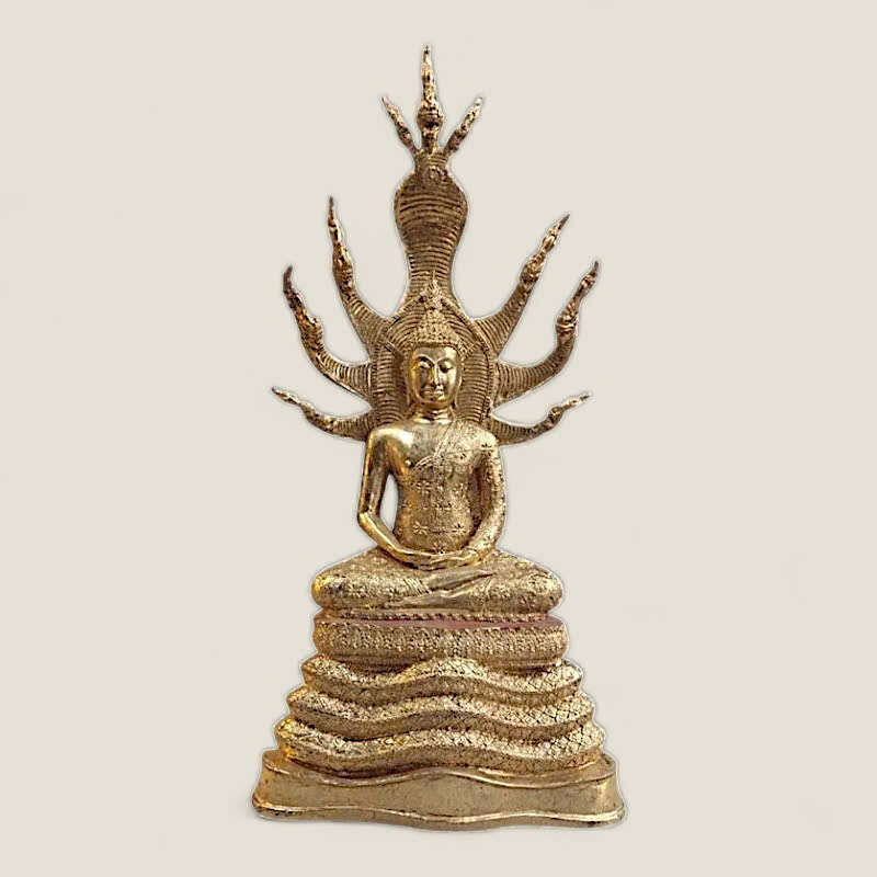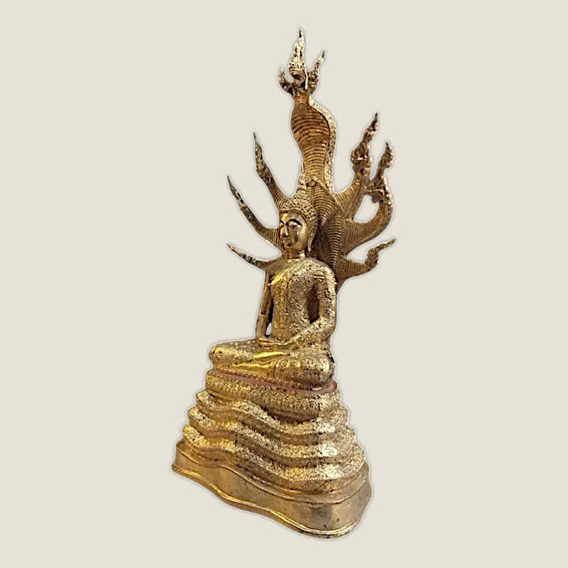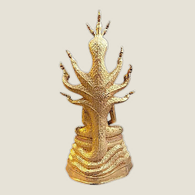 Thiết kế: Tượng Phật được tạo tác trong tư thế ngồi thiền định trên một đài sen, phía sau là hình ảnh một con rắn hổ mang (Naga) đang giương cao 7 đầu để che chở cho Ngài. Hình tượng này mô tả lại sự kiện rắn thần Naga che mưa cho Đức Phật trong quá trình Ngài thiền định. Các chi tiết trên tượng được chạm khắc tỉ mỉ, từ y phục của Đức Phật đến từng vảy của con rắn.